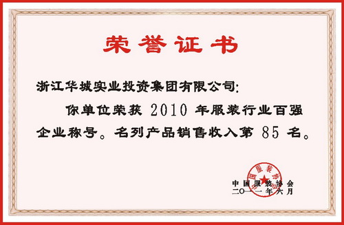 華城集團作為平湖服裝行業(yè)的骨干企業(yè),不僅排列于平湖服裝行業(yè)十強之首,而且在全國服裝行業(yè)百強企業(yè)排序中,浙江華城實業(yè)投資集團有限公司連續(xù)榜上有名,榮獲2010年全國服裝行業(yè)百強企業(yè)榮譽稱號,名列利潤總額第84名;產(chǎn)品銷售收入第85名;銷售利潤第89名共三個指標(biāo)的榮譽稱號,這是集團公司自2005年以來連續(xù)六年獲此殊榮,成為嘉興地區(qū)唯一能連續(xù)榮獲全國服裝行業(yè)百強企業(yè),顯示了華城集團努力拼搏的成功與輝煌。華城能連續(xù)跨入中國服裝百強企業(yè)行列,創(chuàng)下企業(yè)發(fā)展史上前所未有的佳績,榮譽實為來之不易。這是全體華城員工在董事長的正確領(lǐng)導(dǎo)下,同心同德、奮力拼搏、努力奉獻共同取得的成果。華城人始終堅信服裝企業(yè)生命力的長短來于理念,效益的高低在于管理。我們?nèi)A城從小到大、從弱到強,能如此充滿生機與活力,再一次證明了先進的企業(yè)文化是企業(yè)生存和發(fā)展的內(nèi)在動力。文化凝聚人心,文化是動力之源,文化是企業(yè)提升核心競爭力的靈魂。企業(yè)形象靠企業(yè)文化來塑造,企業(yè)聲譽靠企業(yè)文化來傳播,企業(yè)素質(zhì)靠企業(yè)文化來提高,企業(yè)精神靠企業(yè)文化來培育,企業(yè)品牌靠企業(yè)文化來宣傳。華城企業(yè)文化的形成與發(fā)展,標(biāo)志著企業(yè)已由企業(yè)經(jīng)營正走向經(jīng)營企業(yè)的進程。