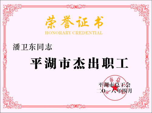 我公司員工潘衛(wèi)東獲得平湖市“杰出職工”榮譽稱號