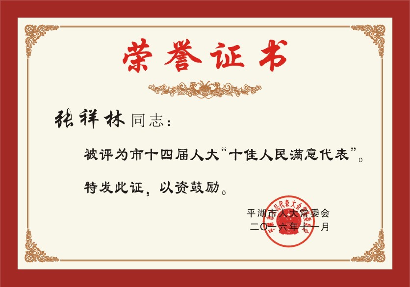 當(dāng)前位置:首頁 > 華城動(dòng)態(tài) 11月8日下午,平湖市十四屆人大代表會(huì)議暨“十佳人民滿意代表”頒獎(jiǎng)典禮在平湖市廣電劇院隆重舉行。我公司董事長(zhǎng)張祥林深孚眾望,被評(píng)為市十四屆人大“十佳人民滿意代表”。