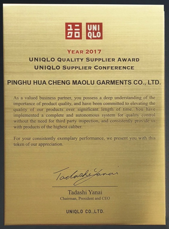 2017年2月底,迅銷集團(tuán)公布了全球146家供應(yīng)商名單,其中中國88家,我公司就是其中最優(yōu)秀的供應(yīng)商之一。“追求一流的客戶,生產(chǎn)頂尖的世界品牌。”這是我公司的企業(yè)經(jīng)營目標(biāo),F(xiàn)R正是這樣的好客戶。圍繞客戶需求,了解客戶理念,在與FR合作的十九年里,我公司始終用最優(yōu)秀的理念培養(yǎng)最優(yōu)秀的員工,生產(chǎn)最優(yōu)質(zhì)的產(chǎn)品,提供最貼心的服務(wù),與客戶共同奮斗,共同成長。感謝FR客戶提供給我們的廣闊天地,感謝我們每一位員工作出的每一份努力和貢獻(xiàn)。