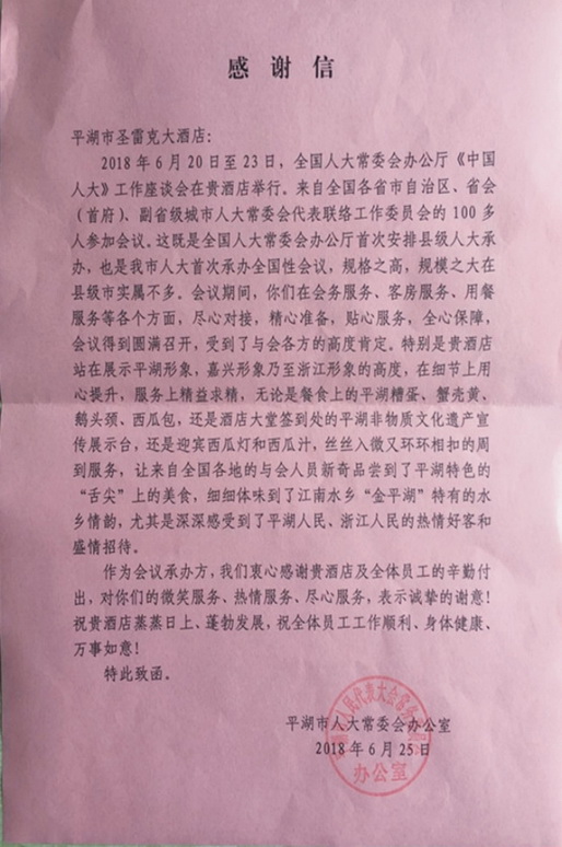 來自全國各省市自治區(qū)、省會(首府)副省級城市人大常委會代表聯(lián)絡(luò)工作委員會的100人參加會議。這既是全國人大常委會辦公廳首次安排縣級人大承辦,也是我市人大首次承辦全國性會議。圣雷克大酒店的出品和服務(wù)獲得與會代表的一致贊譽和與會各方的高度肯定。近日,酒店還收獲了來自平湖市人大常委會辦公室的表揚信。