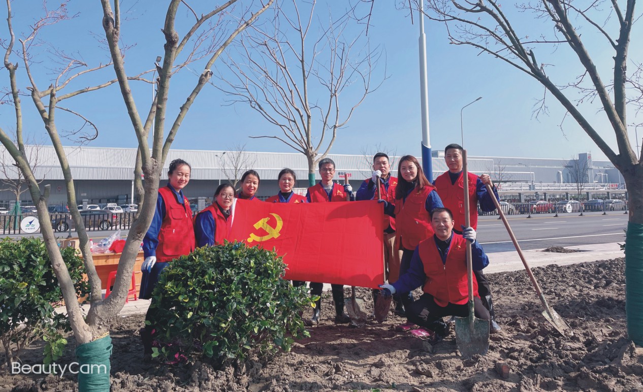 當(dāng)日早上8:30在陳書記的帶領(lǐng)下,一支由四男六女共十人組成的志愿隊從公司出發(fā),大概十分鐘左右的車程,到達了此次植樹活動的目的地,即長城汽車公司路段�?紤]到泥地濕滑,書記已貼心地為每個人提前準(zhǔn)備好了雨鞋,換上雨鞋、穿上紅馬夾、戴上紗手套、抓起鐵鍬,為接下來的勞動做好了預(yù)熱準(zhǔn)備。我們的隊伍徑直走到了自己的包干區(qū),看著周圍一群群同樣穿著紅馬夾的其他公司的志愿者們,一腔勞動的熱血馬上涌上心頭,二話不說,拿鐵鍬的伙伴們早已瞄準(zhǔn)了那個事先定位好的樹坑,圍著坑一鏟一鏟地開始挖土。我們先選了小的灌木下手,所以十人的隊伍自覺地分成了兩個小分隊,有的挖土,有的抬樹,還有的在一旁用相機記錄下這激情時刻,可謂一派熱火朝天的景象。種好了灌木,我們十人組合開始齊心協(xié)力應(yīng)對那幾棵大樹,相比灌木而言,需要把坑挖得更大些,抬樹也需要更多的力氣,因為香泡樹身上長刺,無法接觸樹的上部,只能靠接觸樹干下部有布包住的位置用力。此時男同胞們充分發(fā)揮了他們的男性力量,兩三人同時用力,再加上一兩人拉起樹根的捆繩,終于穩(wěn)穩(wěn)地將樹放置到挖好的坑中。將樹放正后女同胞們扶住樹干,男同胞們拿起鐵鍬鏟土填坑,扶樹的女同胞們手沒空,腳也沒有閑著,抽出一只腳,用力地踩著填上來的泥土,讓每一鏟土都準(zhǔn)確地到它該去的地方,發(fā)揮其應(yīng)有的作用。一會兒功夫,一棵大樹就亭亭玉立地出現(xiàn)在了眾人的面前。