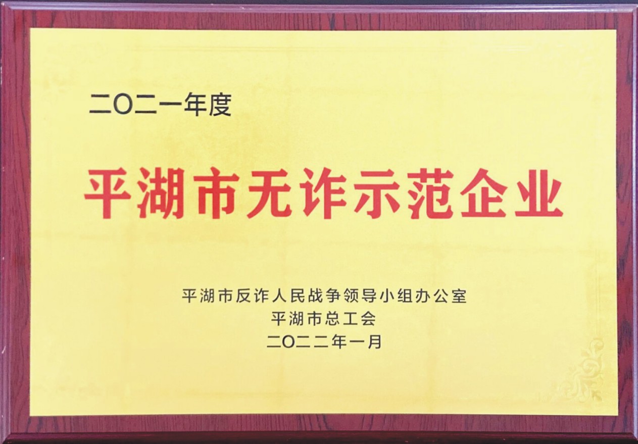 2022年1月,平湖市反詐人民戰(zhàn)爭領(lǐng)導(dǎo)小組辦公室、市總工會(huì)授予平湖華城衣歌路服飾有限公司2021年度“平湖市無詐示范企業(yè)”榮譽(yù)稱號。