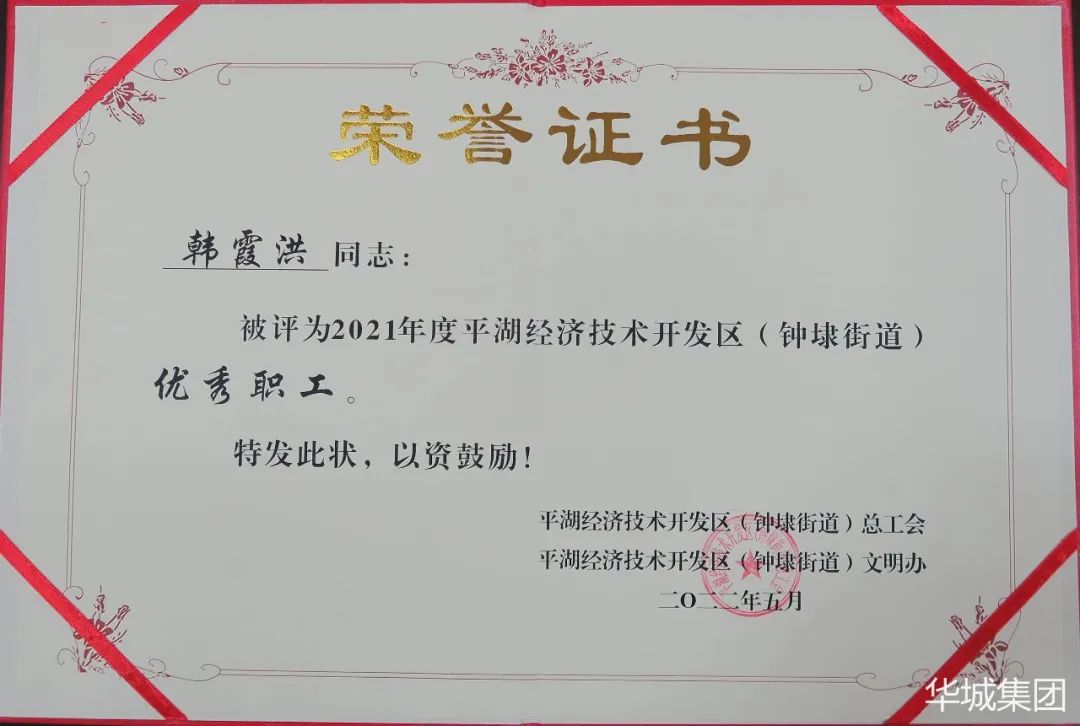 平湖華城衣歌路服飾有限公司員工韓霞洪榮獲“優(yōu)秀職工”稱號。