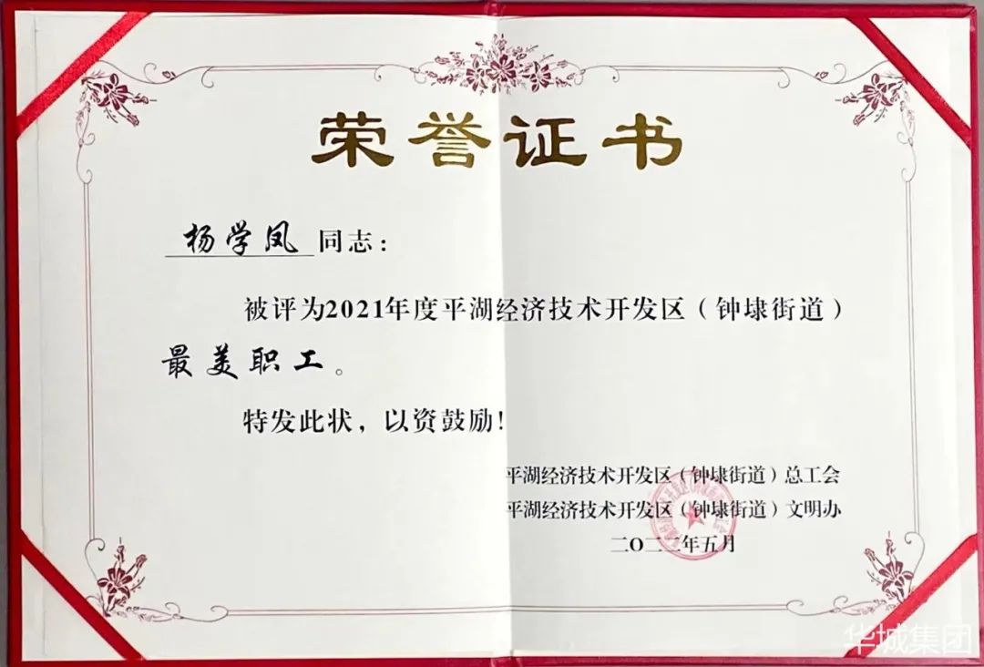 平湖市華城制衣股份有限公司員工陳麗芳榮獲“優(yōu)秀職工”稱號。