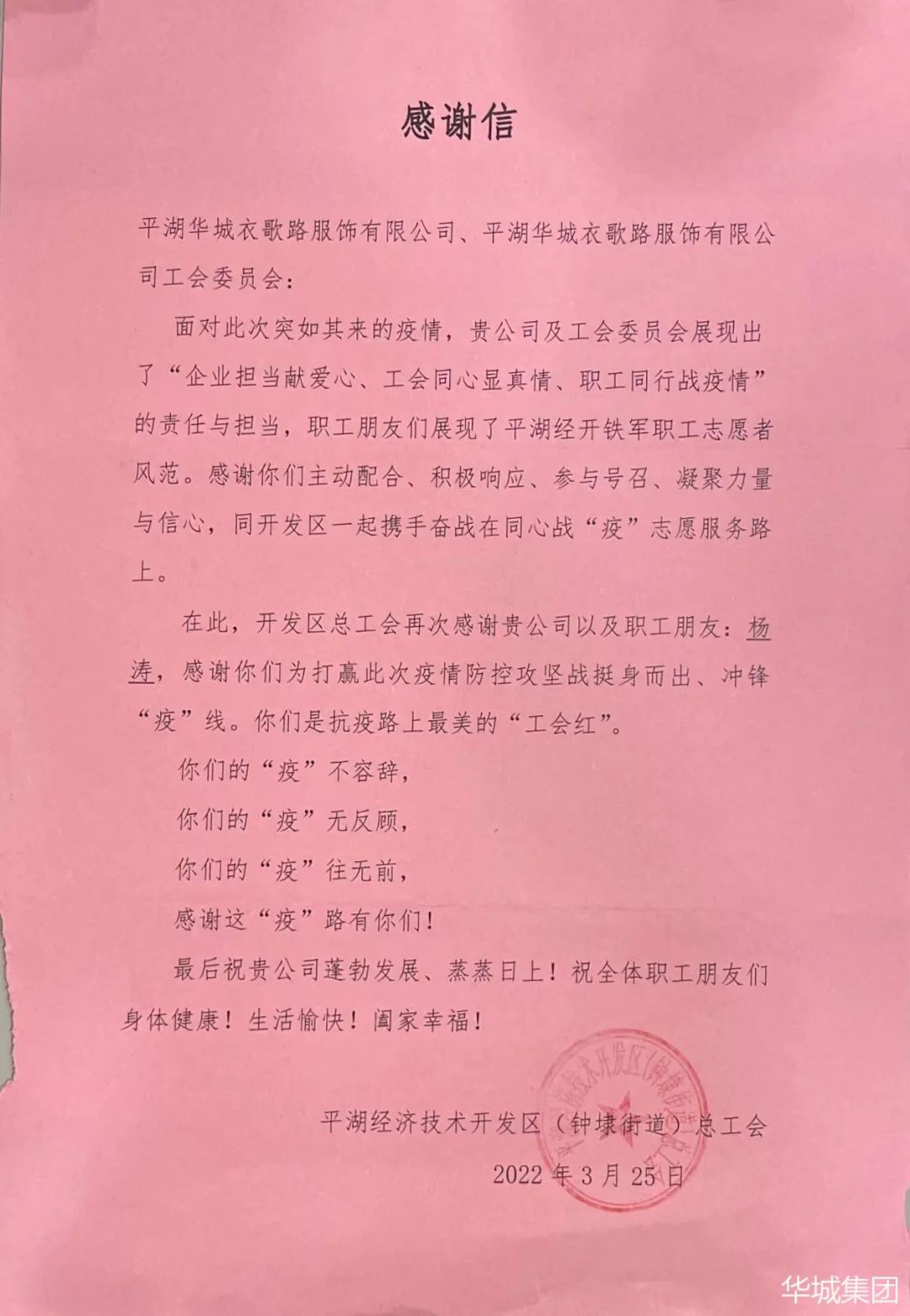 來信對(duì)華城衣歌路及其工會(huì),在疫情防控工作中所作的貢獻(xiàn)給予高度的評(píng)價(jià)與感謝。信中肯定和表彰了企業(yè)克服現(xiàn)實(shí)中的重重困難,在第一時(shí)間積極展開抗“疫”行動(dòng),企業(yè)擔(dān)當(dāng)獻(xiàn)愛心,工會(huì)同心顯真情,職工同行戰(zhàn)疫情。
