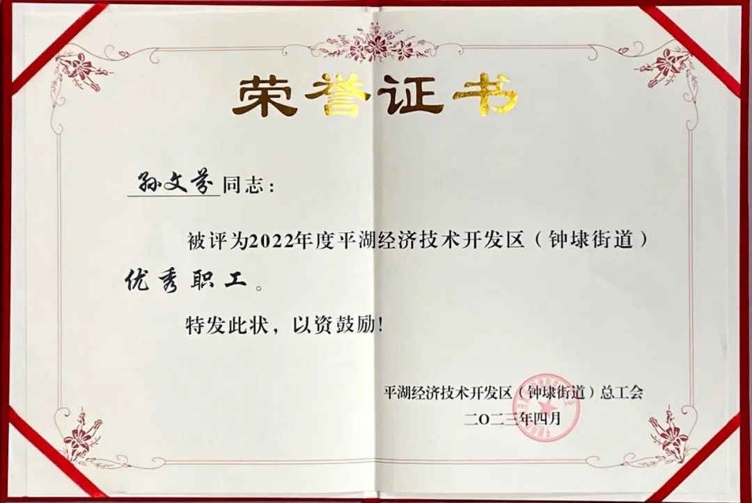 平湖市華城制衣股份有限公司員工孫文芬榮獲“2022年度平湖經(jīng)濟技術開發(fā)區(qū)(鐘埭街道)優(yōu)秀職工”稱號;