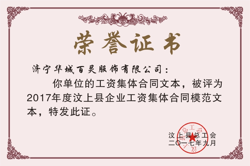 與會人員觀看了汶上縣工資集體協(xié)商紀(jì)實(shí)片,總結(jié)了2017年上半年工資集體協(xié)商工作,李春生同志宣讀了《關(guān)于表彰汶上縣企業(yè)工資集體協(xié)商合同文本展評先進(jìn)單位的決定》,段主席、白部長分別對獲獎企業(yè)進(jìn)行頒獎,授予濟(jì)寧華城百靈服飾有限公司等5家企業(yè)工資集體協(xié)商合同模范文本,各獎現(xiàn)金2000元。會上模范文本企業(yè)代表作了交流發(fā)言,學(xué)習(xí)了開展工資集體協(xié)商的先進(jìn)經(jīng)驗(yàn),交流了優(yōu)秀做法,充分調(diào)動了企業(yè)、職工參與協(xié)商的積極性。