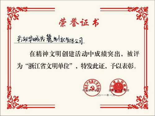 中共浙江省委、浙江省人民政府在2011年1月21日下發(fā)了浙委[2011]8號(hào)文件,通報(bào)命名表彰了一批浙江省示范文明城市、文明社區(qū)、文明單位和文明鎮(zhèn)。平湖華城茂麓制衣有限公司榜上有名,被命名為“浙江省文明單位”。