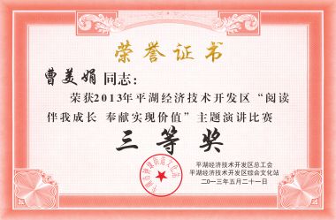 比賽現(xiàn)場精彩紛呈,各企業(yè)選手經(jīng)過精心的準(zhǔn)備,都發(fā)揮出了較高演講水平,在文字中賦予了激情和夢想、勇氣和力量,演講時(shí)聲情并茂,字字珠璣,落地有聲,深深地感染了現(xiàn)場評委和觀眾。按照此次比賽要求,全部參賽選手都是脫稿演講,每個(gè)選手各自發(fā)揮所長,盡情展示風(fēng)采,比賽進(jìn)行得非常激烈。通過預(yù)賽和決賽,選出了一、二、三等獎(jiǎng)各若干名,我公司員工曹美娟榮獲本次演講賽三等獎(jiǎng)。