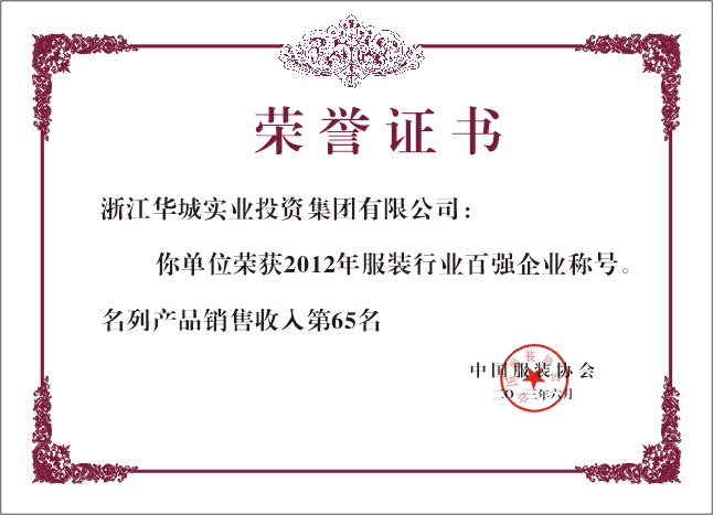 日前,中國服裝協(xié)會(huì)正式發(fā)布“2012年服裝行業(yè)百強(qiáng)企業(yè)”名單,全國共有143家企業(yè)榜上有名,其中浙江38家,作為平湖服裝企業(yè)龍頭單位的浙江華城實(shí)業(yè)投資集團(tuán)有限公司再次榮獲百強(qiáng)企業(yè)光榮稱號(hào)。
