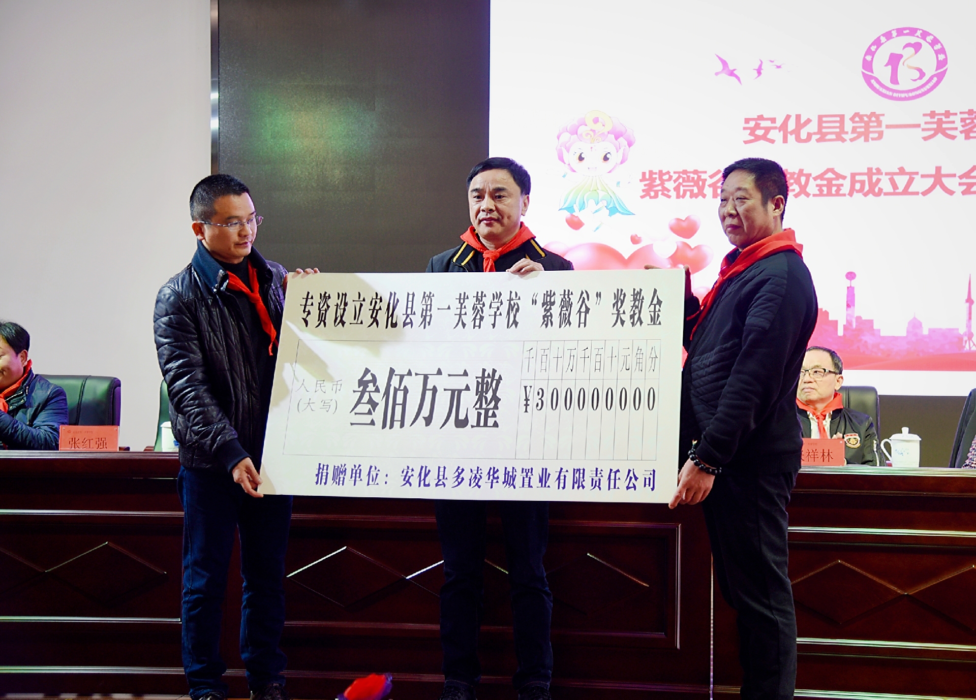 為了把學校辦成政府滿意、社會滿意、家長滿意的一流學校,有效推進安化縣教育事業(yè)的發(fā)展,進一步弘揚尊師重教的良好風尚,形成全社會共同關(guān)心、支持教育事業(yè)的良好氛圍。同時努力改善第一芙蓉學校辦學條件、提升辦學質(zhì)量,鼓勵教育教學成績突出的優(yōu)秀教師更加勤奮工作,鼓勵品學兼優(yōu)的在讀學生勤奮學習,并兼顧資助貧困山區(qū)的建檔立卡優(yōu)秀學生完成學業(yè),為國家培養(yǎng)更多的優(yōu)秀人才,力爭把芙蓉學校辦成安化縣內(nèi)最好、益陽市內(nèi)一流的學校,安化縣多凌華城置業(yè)有限責任公司通過縣慈善總會捐贈300萬元、設立“安化縣第一芙蓉學校紫薇谷獎教金”。通過獎勵、資助,提高學校教育教學水平,激發(fā)學生努力學習,推動第一芙蓉學校教育教學蓬勃發(fā)展。