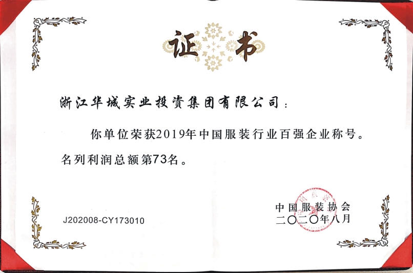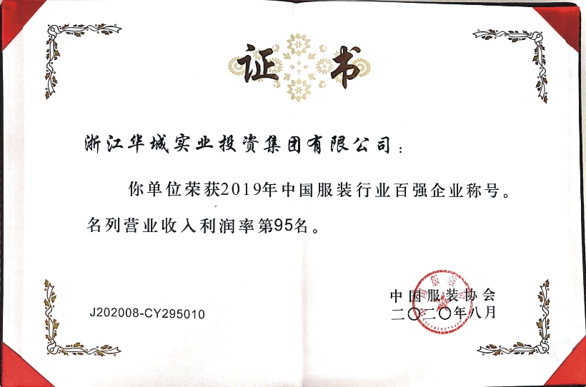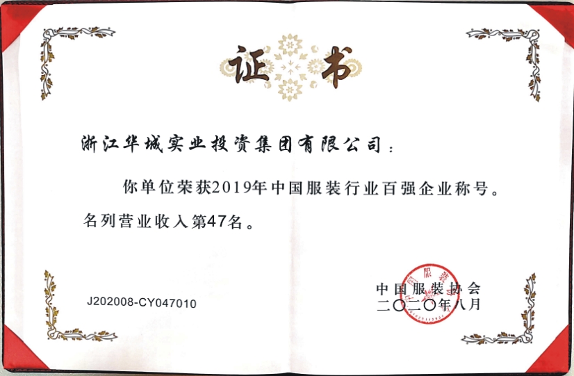 2020年8月,中國(guó)服裝協(xié)會(huì)正式發(fā)布“2019年服裝行業(yè)百?gòu)?qiáng)企業(yè)”名單。我集團(tuán)公司以“營(yíng)業(yè)收入第47名” “利潤(rùn)總額第73名”“營(yíng)業(yè)收入利潤(rùn)率第95名”再次榮登中國(guó)服裝行業(yè)百?gòu)?qiáng)企業(yè)行列,這已是我公司第15次獲此殊榮。