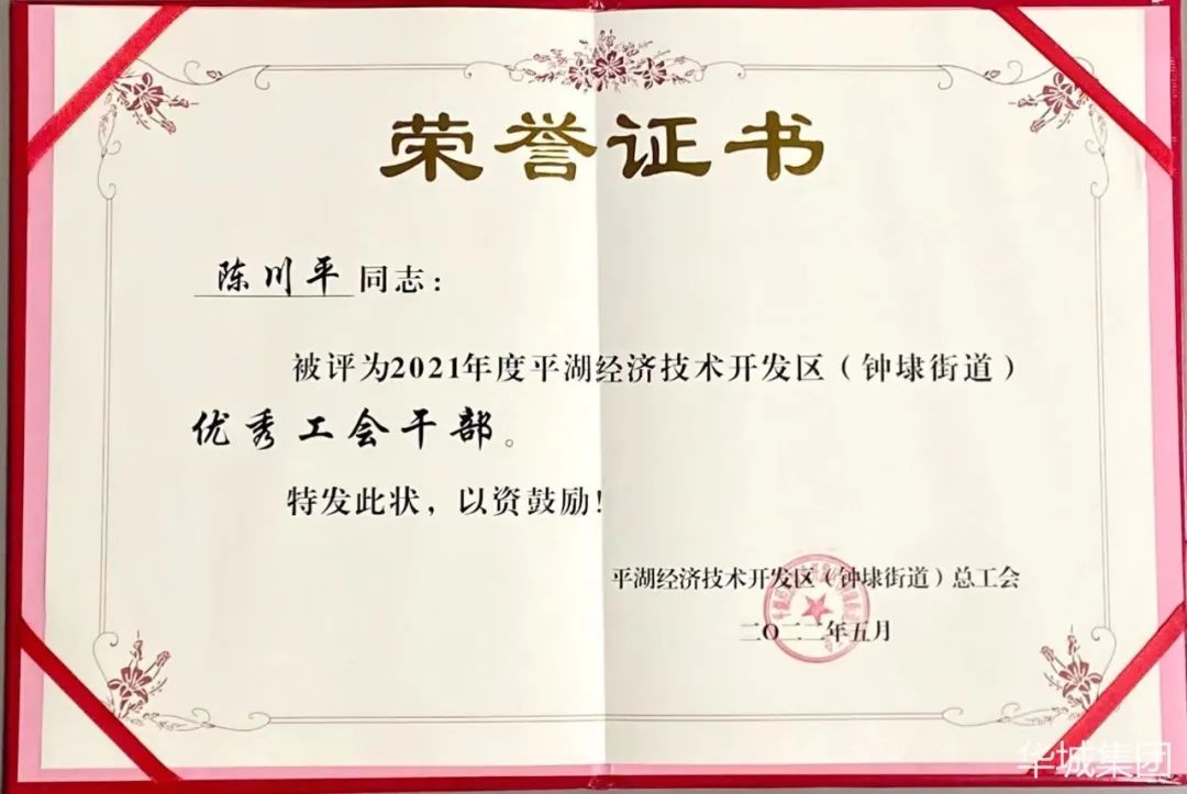 平湖華城茂麓制衣有限公司工會主席陳川平榮獲經開“優(yōu)秀工會干部”稱號。