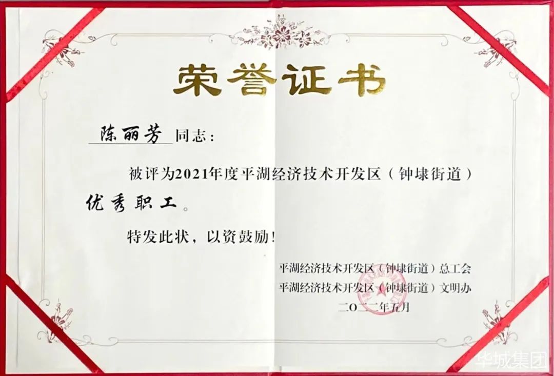 平湖市華城制衣股份有限公司員工陳麗芳榮獲“優(yōu)秀職工”稱號。