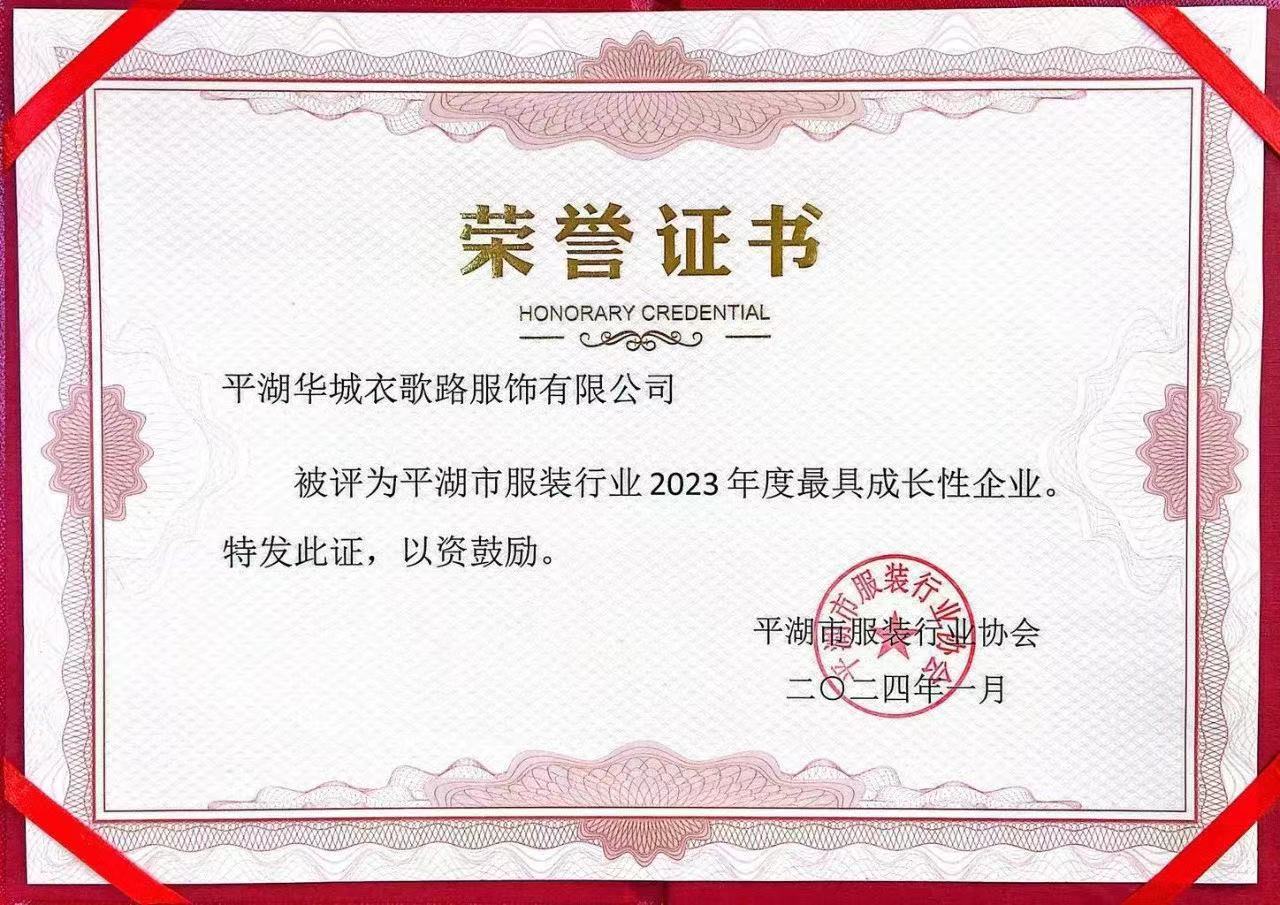 平湖華城衣歌路服飾有限公司榮獲“2023年度最具成長性企業(yè)”稱號