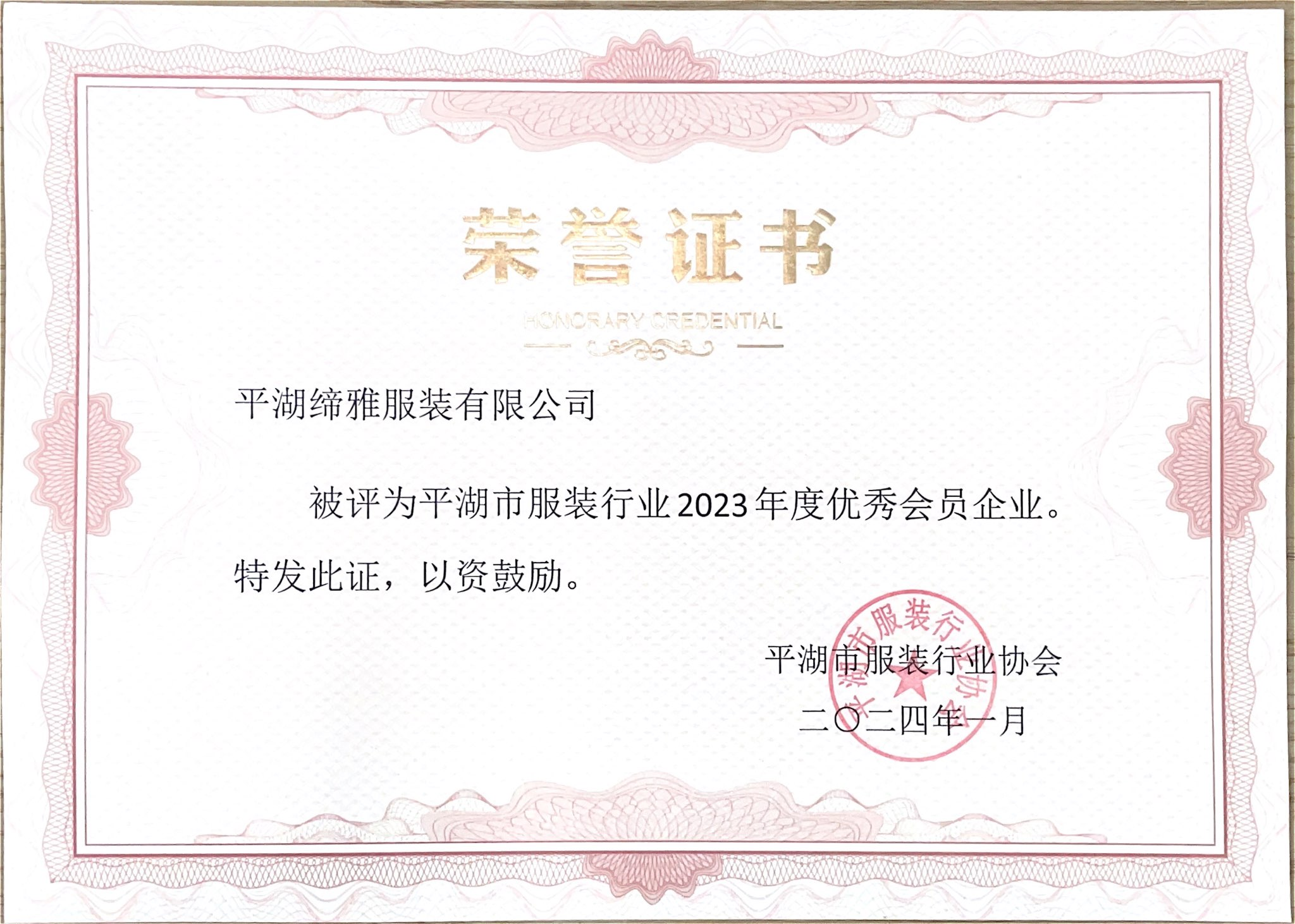 平湖締雅服裝有限公司榮獲“2023年度優(yōu)秀會員企業(yè)”稱號