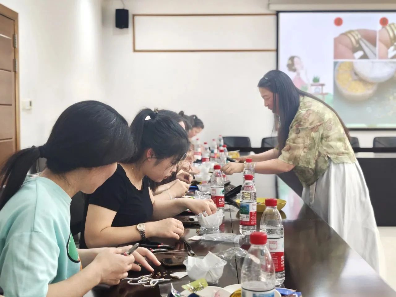 在精彩的講座結束之后,緊接著是一場沉浸于古典韻味的“非遺壓襟”體驗活動,讓企業(yè)員工們仿佛穿越回古代,領略傳統(tǒng)文化的非凡魅力�;顒右潦�,佳子老師向員工們深入講解了“壓襟”這一非物質文化遺產(chǎn)的起源和制作特色。在制作中,通過佳子老師的悉心指導,大家從選擇材料的順序、構思設計到組裝,每一步都充滿了樂趣和挑戰(zhàn)。
